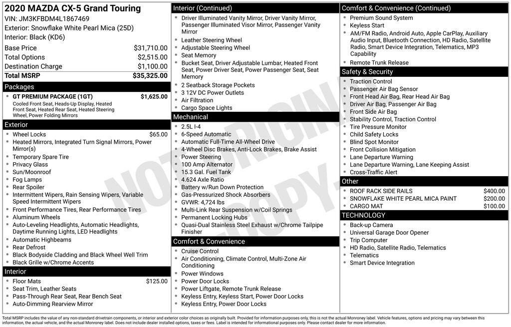 Whether tackling your daily errands or embarking on a family adventure, the 2020 Mazda CX-5 Grand Touring is the perfect companion. Experience the difference that exceptional craftsmanship, cutting-edge features, and Mazda's renowned driving dynamics can make. Schedule a test drive today and discover the joy of owning this exceptional crossover.