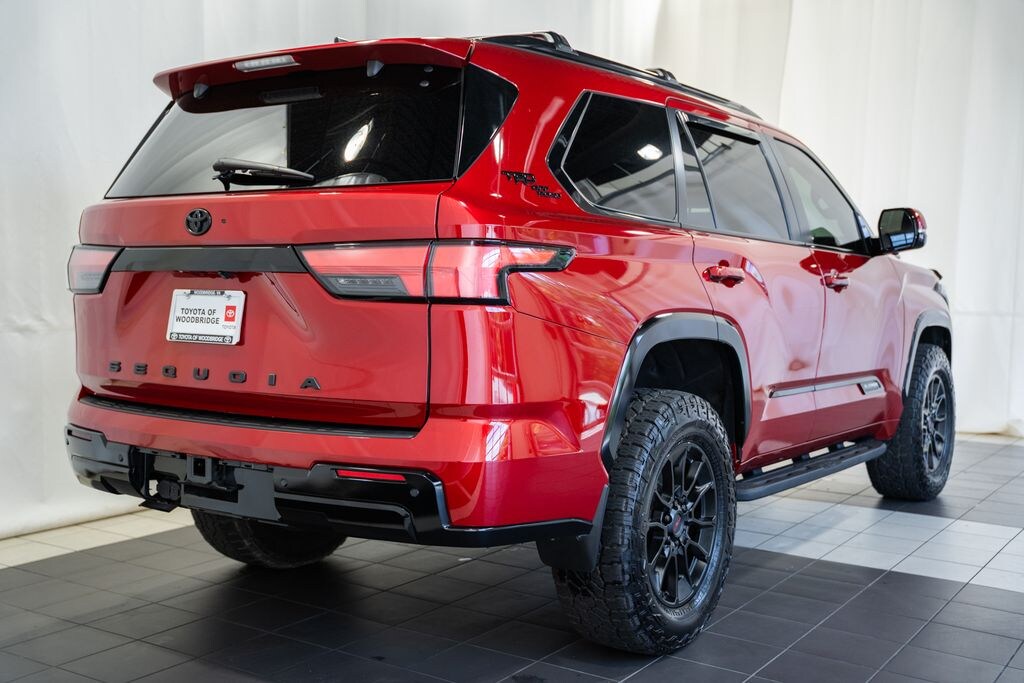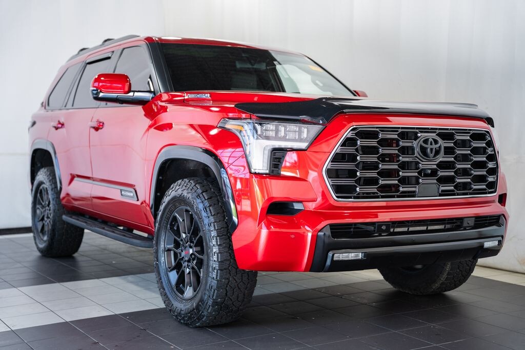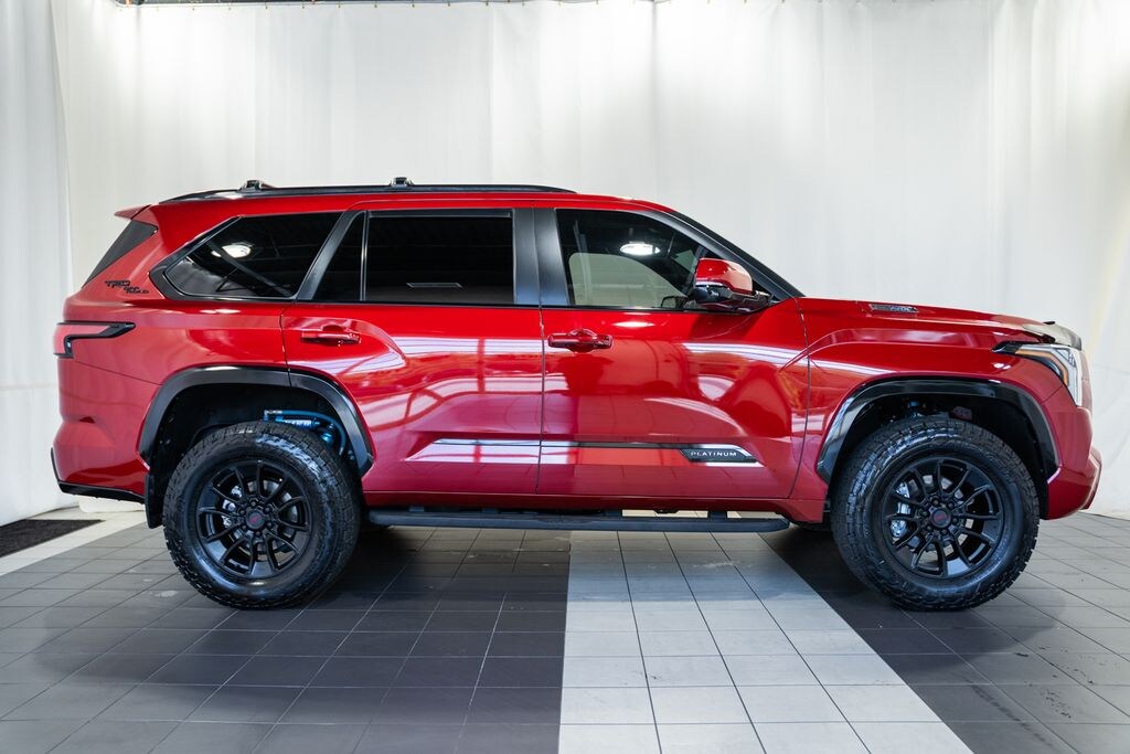 Prices on vehicles include freight and destination charges (applies to new vehicles only) , as well as a $999 Dealer Processing Fee. PANORAMIC ROOF / DUAL SUNROOFS / TWIN PANEL MOONROOF, POWER MOONROOF / SUNROOF / POWER TILT SLIDING ROOF, VOICE ACTIVATED NAVIGATION, NAVIGATION / GPS / NAV, DYNAMIC RADAR CRUISE CONTROL / ADAPTIVE CRUISE CONTROL / SMART CRUISE CONTROL, LANE DEPARTURE WARNING, LANE DEPARTURE ALERT / LANE KEEPING ALERT, LANE DEPARTURE w/ STEERING ASSIST, LANE DEPARTURE WARNING, REARVIEW CAMERA / BACK UP CAMERA / REVERSE CAMERA, REAR VIEW CAMERA W/DYNAMIC GUIDELINES, ANDROID AUTO & APPLE CARPLAY, LEATHER SEATS, HEATED & COOLED FRONT ROW SEATS, HEATED FRONT ROW SEATS, HEATED SECOND ROW SEATS, POWER WINDOWS & LOCKS, FOUR WHEEL DRIVE / 4WD / 4X4, STEERING WHEEL AUDIO CONTROLS, CRUISE CONTROL, REAR CROSS TRAFFIC ALERT, PUSH-BUTTON START, PREMIUM AUDIO SOUND SYSTEM, POWER SLIDING REAR WINDOW, BLUETOOTH AUDIO STREAMING, BLUETOOTH & BLUETOOTH STREAMING, BLUETOOTH HANDS-FREE PHONE SYSTEM, ONE OWNER, HEATED STEERING WHEEL, DUAL ZONE A/C CONTROLS, BLUETOOTH, AUTOMATIC HIGH BEAMS, AUTO HIGH BEAMS, 3RD ROW SEATING, TOYOTA SAFETY SENSE, ROAD SIGN ASSIST, WIRELESS ANDROID AUTO, WIRELESS APPLE CAR PLAY, 14 Speakers, 3.31 Axle Ratio, 3rd row seats: split-bench, 4-Wheel Disc Brakes, ABS brakes, Air Conditioning, All-Weather Liners/Cargo Mat (TMS), Alloy wheels, AM/FM radio: SiriusXM, Apple CarPlay/Android Auto, Auto High-beam Headlights, Automatic temperature control, Brake assist, Bumpers: body-color, Cast Aluminum Step & Step Cover, Compass, Delay-off headlights, Electronic Stability Control, Exterior Parking Camera Rear, Front Bucket Seats, Front Center Armrest w/Storage, Front dual zone A/C, Front fog lights, Front reading lights, Fully automatic headlights, Head Up Display (HUD), Headlight cleaning, Heated & Ventilated Front Seats, Heated front seats, Heated rear seats, Heated steering wheel, Illuminated entry, Leather Seat Trim, Leather steering wheel, Low tire pressure warning, Multi-Terrain Back Monitor, Navigation System, Navigation system: Drive Connect (1 year trial) includes Cloud Navigation with real time traffic and Google POI, Panic alarm, Passenger door bin, Power door mirrors, Power driver seat, Power Liftgate, Power moonroof, Power passenger seat, Power steering, Power windows, Premium audio system: JBL, Radio: JBL Premium Audio System, Rain sensing wipers, Rear air conditioning, Rear reading lights, Rear seat center armrest, Rear window defroster, Rear window wiper, Reclining 3rd row seat, Remote keyless entry, Roof Cross Bars (TMS), Security system, Speed control, Speed-sensing steering, Split folding rear seat, Spoiler, Steering wheel mounted audio controls, Tilt steering wheel, Traction control, TRD Front Skid Plate, TRD Off-Road Package, Trip computer, Turn signal indicator mirrors, Under Cover & Protector, Variably intermittent wipers, Ventilated front seats, Ventilated rear seats, Voltmeter, Wheels: 20" Black TRD Alloy. 2024 Toyota Sequoia Platinum 4WD Supersonic Red V6 Hybrid